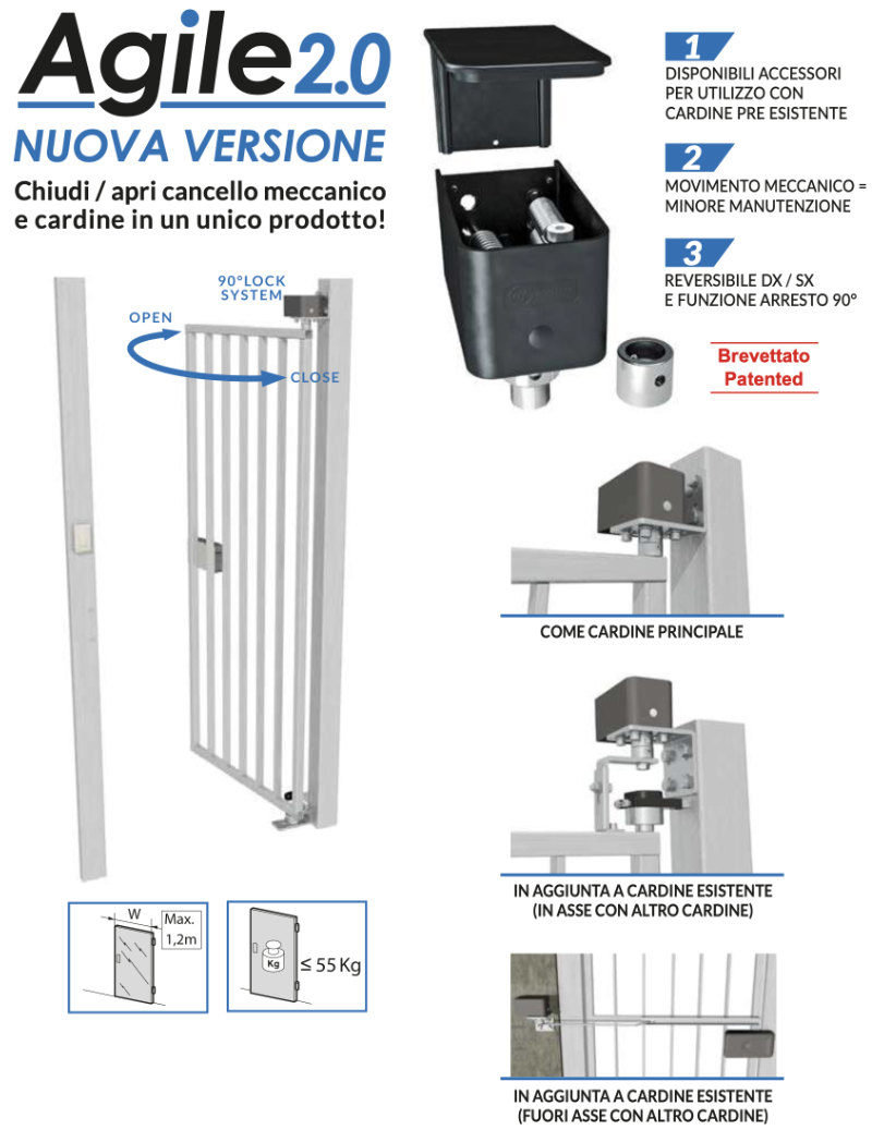 Agile 2.0 Nova-Ferr is a mechanical gate closer / gate opener / spring hinge in a single product : it is ideal for gates or doors and it is a hinge but also a mechanical gate close / opener, very easy to adjust and applicable in any situation .