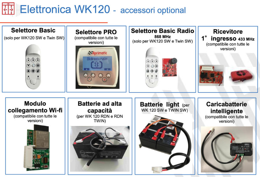 To complete the installation, we recommend adding radar sensors for control and safety, preferably in dual technology. Photocells, remote controls, radio receivers, wireless selectors and Wi-Fi modules are also available. All components are compatible with the WK120 control unit.