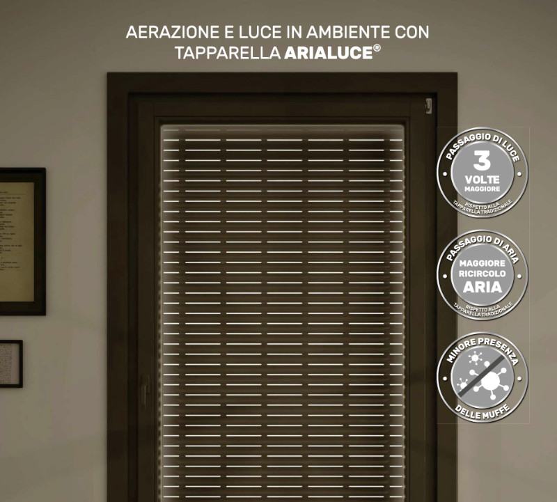 AriaLuce is an insulated aluminum roller shutter with a large hole. Its fundamental feature consists in the particular long slot in the slat, which allows, with the roller shutter lowered, a significant ventilation and lighting of the environment, unlike the traditional roller shutter.