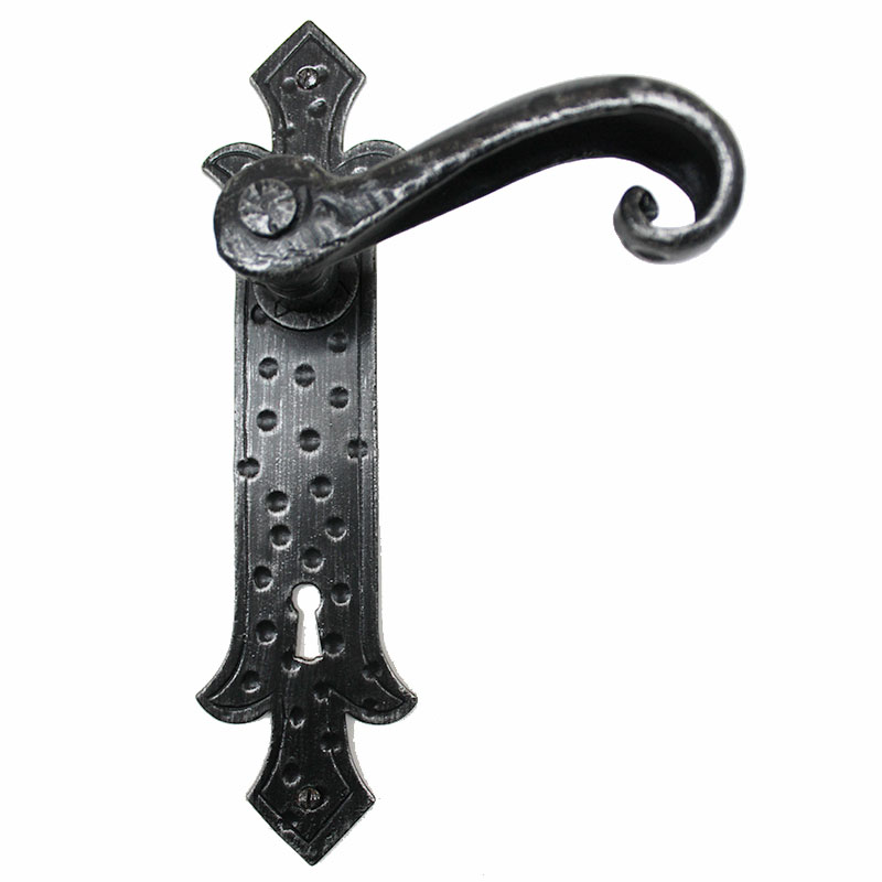 • Artistic wrought iron door handle on plate.