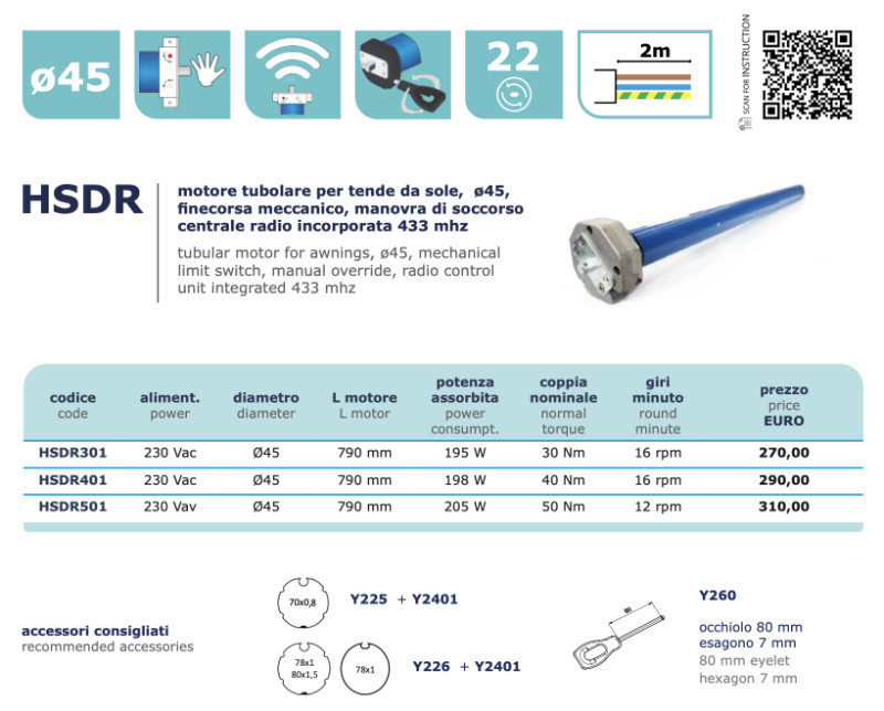 HSDR501 (50Nm) - tubular motor for awnings, ø45, mechanical limit switch, built-in central radio emergency operation 433 mhz.