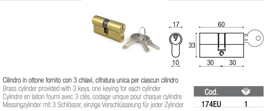 174EU Brevetti Adem lock cylinder is a high quality security component and is made of robust brass and supplied with a set of three keys.