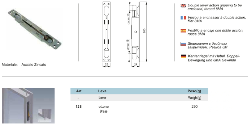 The model code Nova-Ferr 128 is a double action recessed bolt with brass lever and 8MA thread. Here are the measures: