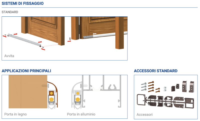 The 1750 draft excluder has a patented mechanism, characterized by double adjustment, in the sense that it is possible to adjust not only the descent, but also the inclination of the same. Added to this is the new Soft Closer version which combines a strong homogeneous pressure along the entire length of the door with a controlled descent limited to the last fraction of the door closing, reducing friction on the floor to a minimum.