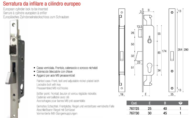 European Cylinder Mortise Lock 767 Brevetti Adem - Made in Italy