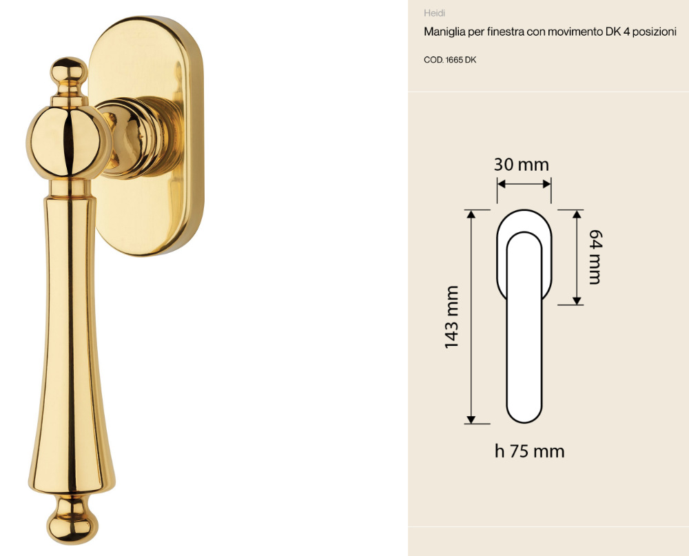 The Heidi Linea Calì window handle is inspired by the refined classic style of the early 20th century , reinterpreted with high-quality materials and details that make it unique. Every curve, every shape tells a story of Italian elegance and tradition.