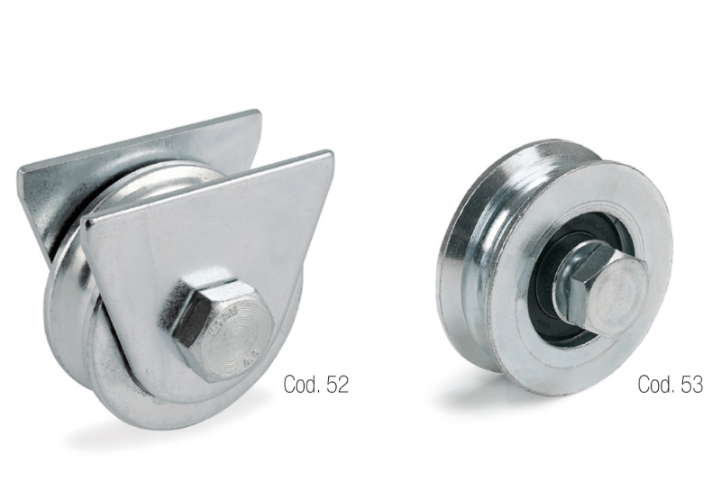 The wheel coded as 52 has a V-shaped mount that allows installation in a groove or on a track, while the wheel coded as 53 has a flat mount. The technical drawings show specific wheel measurements, such as outside diameter, center hole diameter, and other measurements relevant to installation and use.