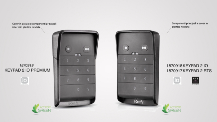 Somfy Keypad 2 keyboard made of recycled plastic , allows you to control up to two motors or IO or RTS receivers of your choice (select the variant according to your needs).