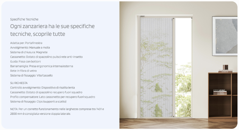 Upon request, it is possible to add a slow rise device, which increases the convenience and safety of use, especially in the presence of children or pets. The mosquito net is designed to be particularly suitable for French windows, with a manual spring winding system that ensures intuitive use and a magnet closing system for a safe and reliable hold.