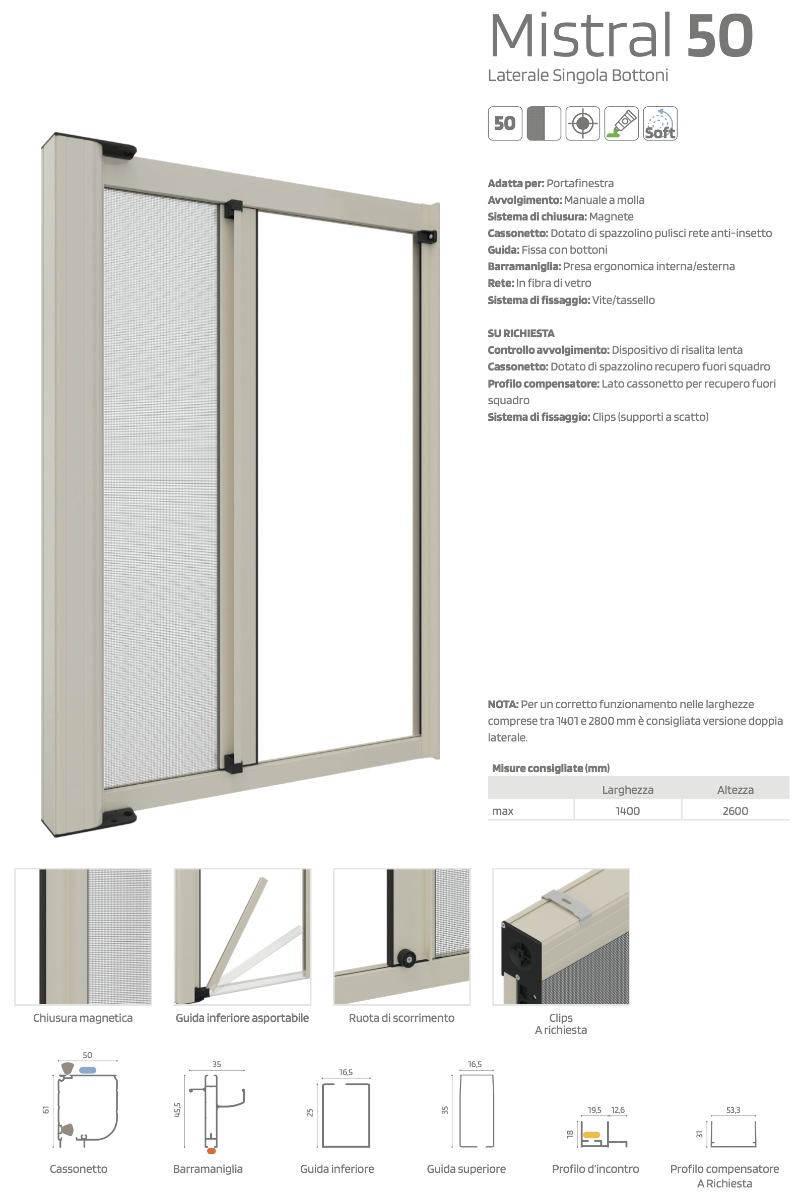 Note: for correct operation in widths between 1401 and 2800 mm, the double lateral version is recommended: Double Side Door Mosquito Net Mistral 50.
