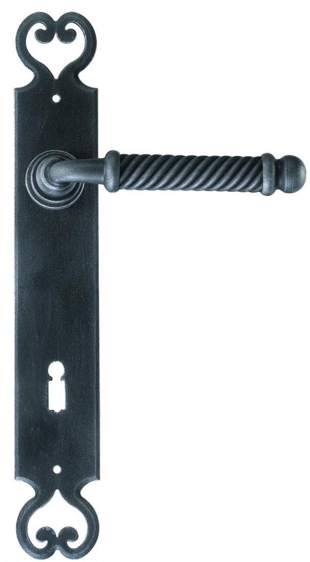 Madrid Galbusera handle is made of wrought iron with a long plate and hand-worked details. Ideal for rustic or traditional environments, available in various handcrafted finishes on Windowo.