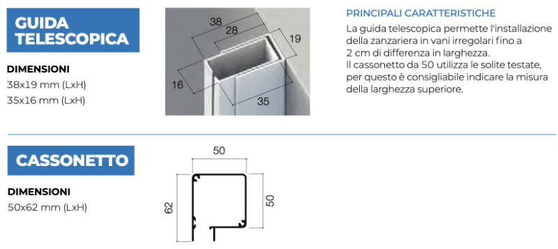 The telescopic guide allows the installation of the mosquito net in irregular spaces up to 2 cm difference in width. The 50 box uses the usual heads, for this reason it is advisable to indicate the measurement of the upper width.