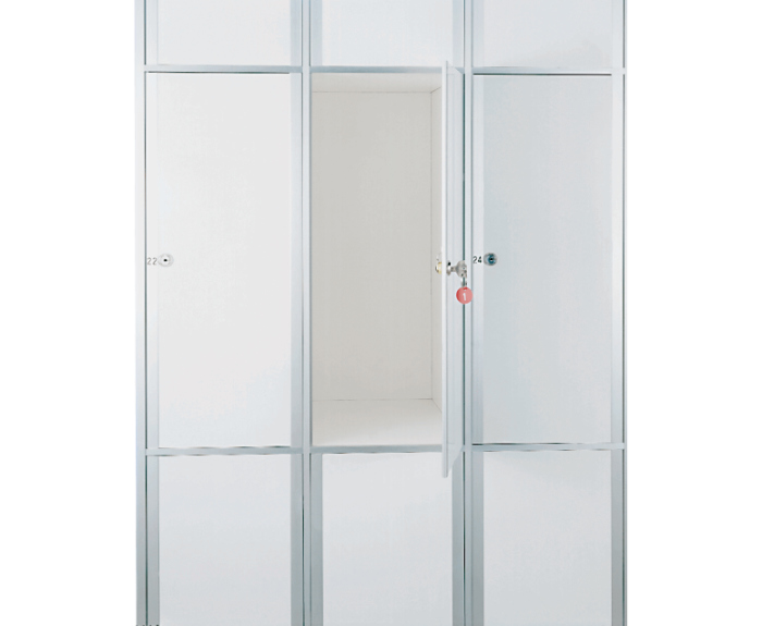 - Doors in white anti-scratch integral laminate (HPL) or in aluminum th. mm. 2, rotating on a full-height hinge, longitudinal edging with round edges in extruded anodized aluminum, vandal-proof closure flush with the structure, progressive numbering engraved;