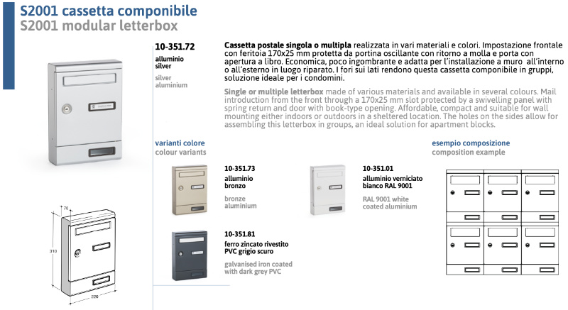 - S 2001 series modular mailbox with dimensions 220x310x70 mm, with front setting;