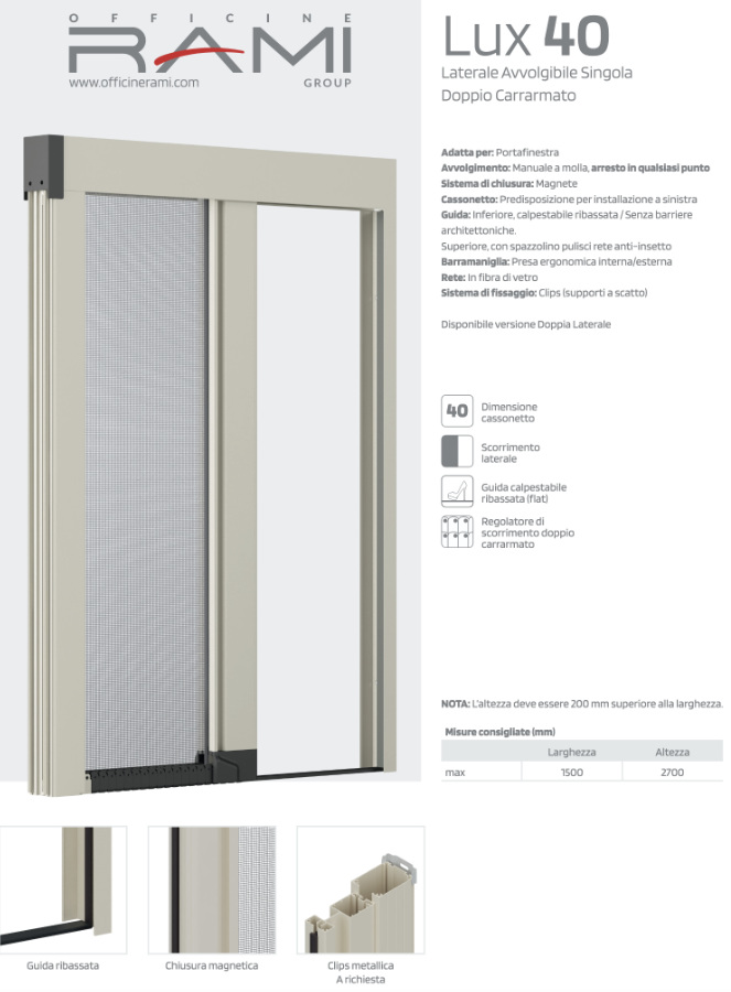 LUX 40 RAMI is the spring-operated side mosquito net by Officine Rami, designed to offer maximum practicality and minimal design. It is a spring-operated side mosquito net with a double tank system and a walkable lowered guide , designed to offer a perfect balance between minimal design, functionality and ease of assembly.