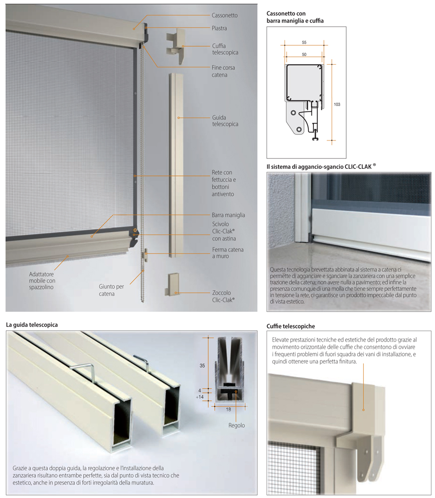 Giudy is a mosquito net with fiberglass and handling chain with the unique Click-Clak, international patent Bettio that allows decoupling of the handle thanks to a simple pull chain. Its chain mechanism combines perfectly with the advantages of the spring system, or ffrendo a product that is articulated without bending and, at the same time, a network which is always perfectly taut.