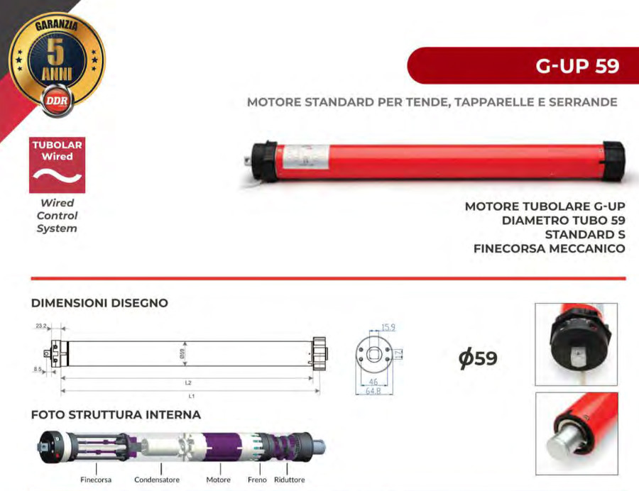 Tubular motor Ø 59 mm with mechanical limit switch, ideal for lifting heavy loads.