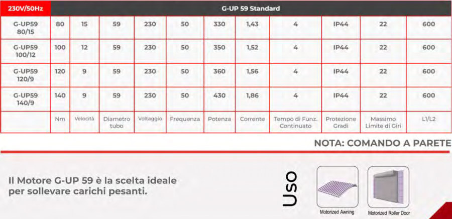 The DDR G-UP 59 motor is designed for the automation of large awnings, roller shutters and shutters. With a tube diameter of 59 mm and a precise mechanical limit switch, it offers reliability and ease of use. It can be ordered in different powers , from 80 Nm to 140 Nm, to adapt to all needs.