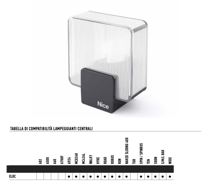 Nice flashing light also compatible with control units of other brands that respect the characteristics.