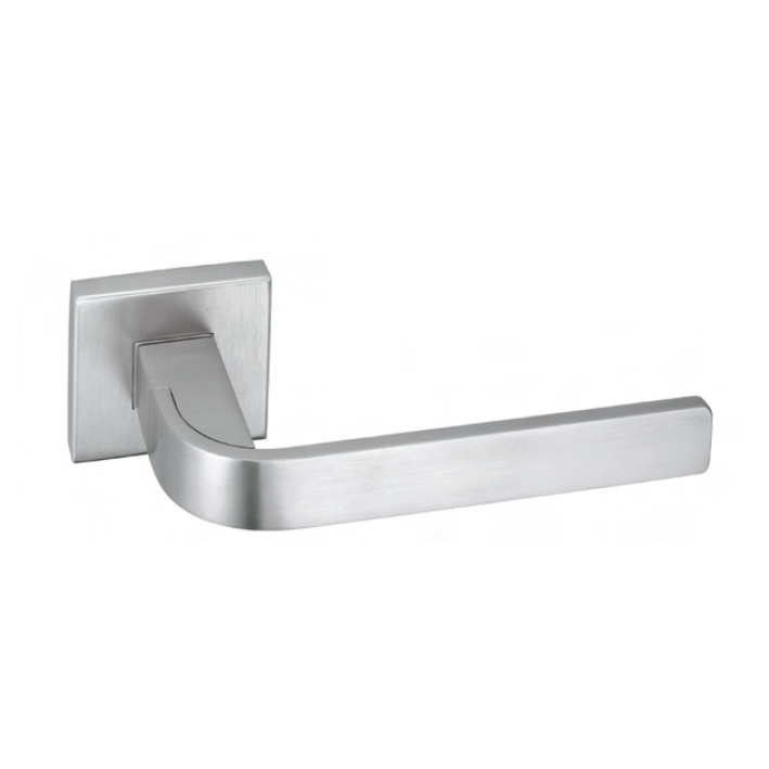 lever handle with 90° bent flat, R=20, on square rose with return spring. Lever handle shape, length 130 mm x 20 mm.