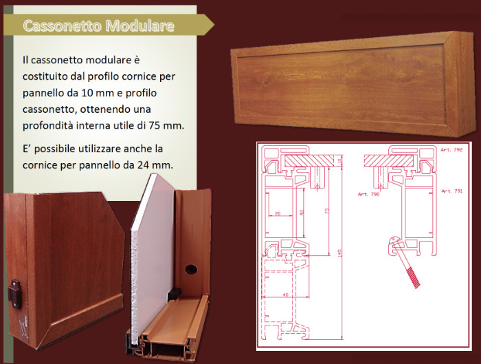• The modular box consists of the frame profile for a 10 mm panel and the box profile, obtaining a useful internal depth of 75 mm;