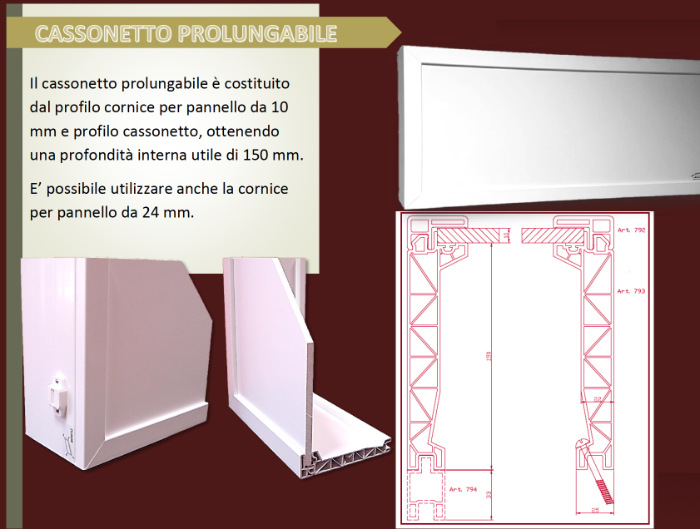 • The extendable box is made up of the frame profile for a 10 mm panel and the box profile, obtaining a useful internal depth of 150 mm;