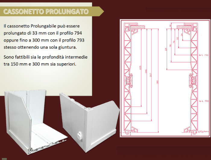 • The extendable box can be extended by 33 mm with the 794 profile or up to 300 mm with the 793 profile itself, obtaining a single joint;