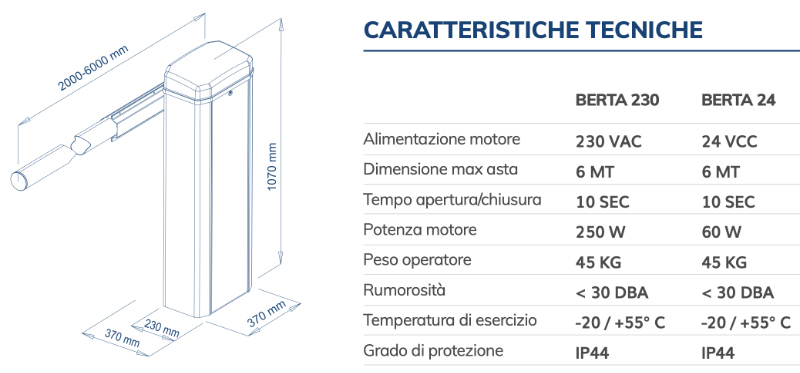 The BERTA VDS automatic barrier is available in the 230V or 24V version with booms up to 6 meters.