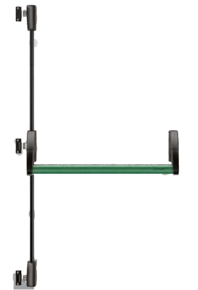 Vertical ambidextrous panic bar with 3 locking points , lever version, in zamak and galvanized steel.