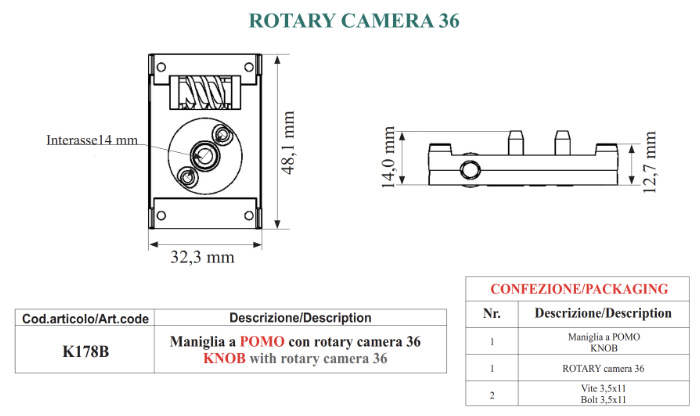The package includes the shutter knob of the selected code and two 3.5x11 mm screws.