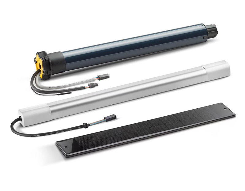 Somfy RS100 Solar io , motor for wireless solar shutters. The RS100 Solar io solar roller shutter motor is equipped with intelligent functions and the new solar roller shutter drive system.