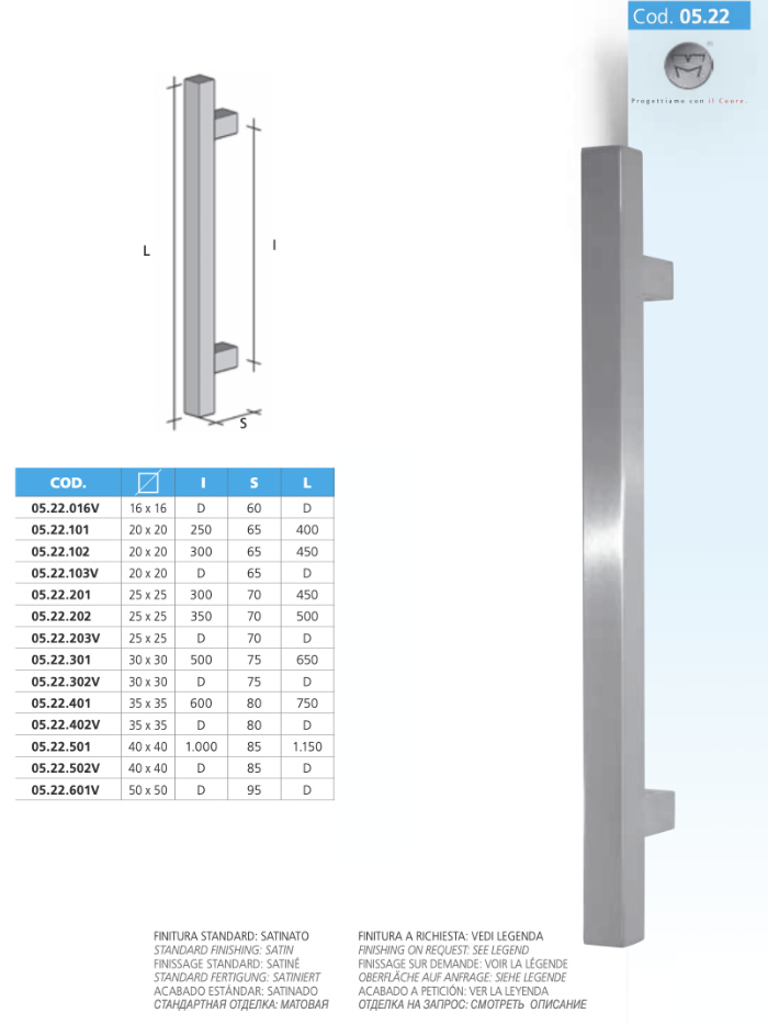 handle in satin, polished or painted AISI 316L stainless steel (select the variant you want), code MPM 05.22.