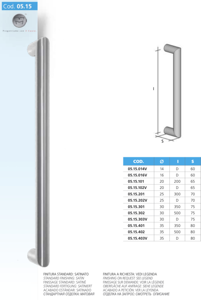 Straight pull handle in satin, polished or painted AISI 316L stainless steel (select the variant you want), produced in Italy by the company MPM (code 05.15).