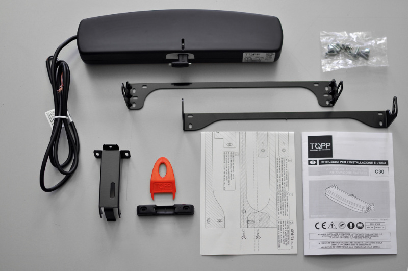 Topp electric actuator model C30 230V with double-link articulated chain, contained in a special casing, complete with support and accessories for top-hung or bottom-hung opening.