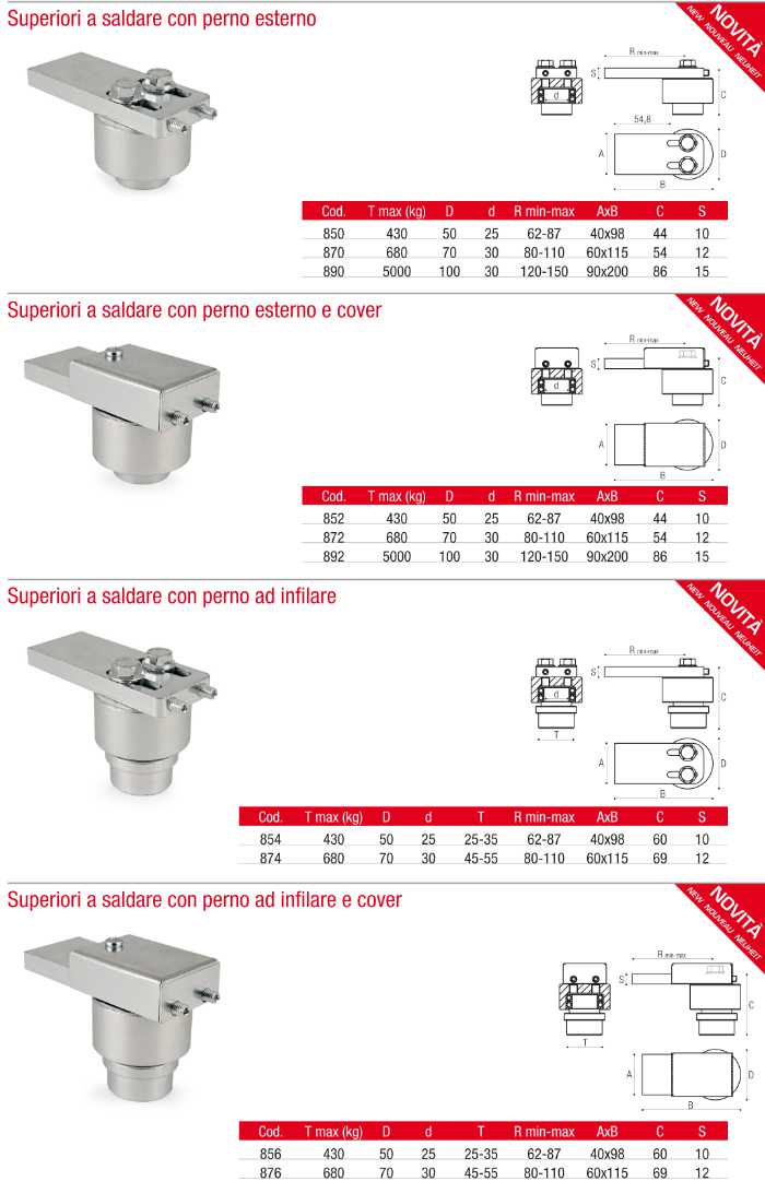• Upper hinges to be welded with external pin and cover (codes 852, 872, 892);