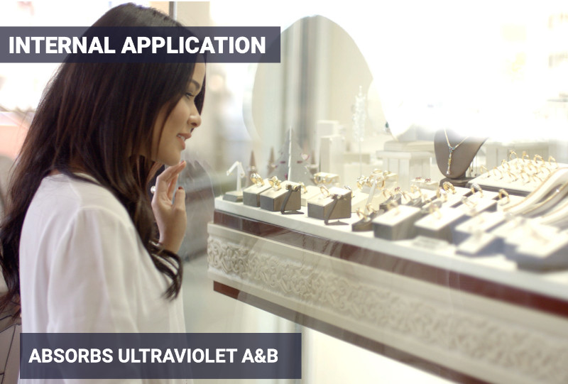 Transparent film for protection from UvA and UvB rays, ideal for delaying the fading of garments displayed in shop windows.